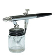 El set lo completan 2 frascos de vidrio, 1 con boquilla para conectarlo al aerógrafo y el otro con tapa normal. Otro contenedor de pintura metálico de tapa abierta se incluye en este kit. Además viene 1 manguera de plástico de M5 x 0,5mm de grosor, 1 adaptador para mangueras de 1/8 bsp (entrada M5 x 0,5 mm macho / entrada 1/8 hembra), 1 colgador para dejar el aerógrafo de manera segura, sujeto a alguna superficie y la llave para abrir el mecanismo para limpieza interior. Para poder conectar este aerógrafo al compresor profesional (ref cod: COPR21218BSF) se necesita el adaptador para aerógrafos 1/8 BSP hembra a M5 x 05 macho.