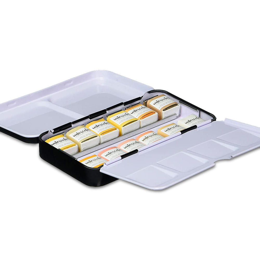 Set Compacto de 12 Acuarelas en Pastillas. Incluye caja metálica con 2 paletas mezcladoras incorporadas. Tarjeta en blanco para muestras de colores.  |