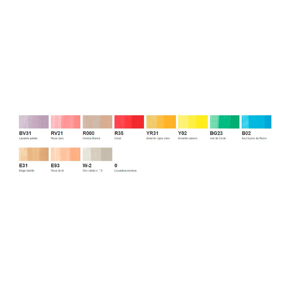 Los marcadores Copic tienen una gran variedad de colores, y si recién comienzas a utilizarlos podría ser difícil elegir la combinación de colores adecuada. En este set se han seleccionado cuidadosamente 12 colores Copic Ciao para que comiences tu proyecto de ilustración.