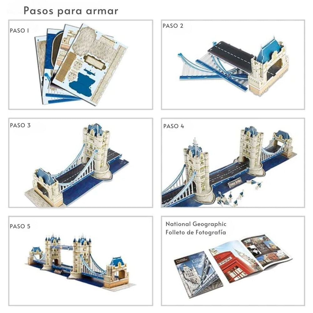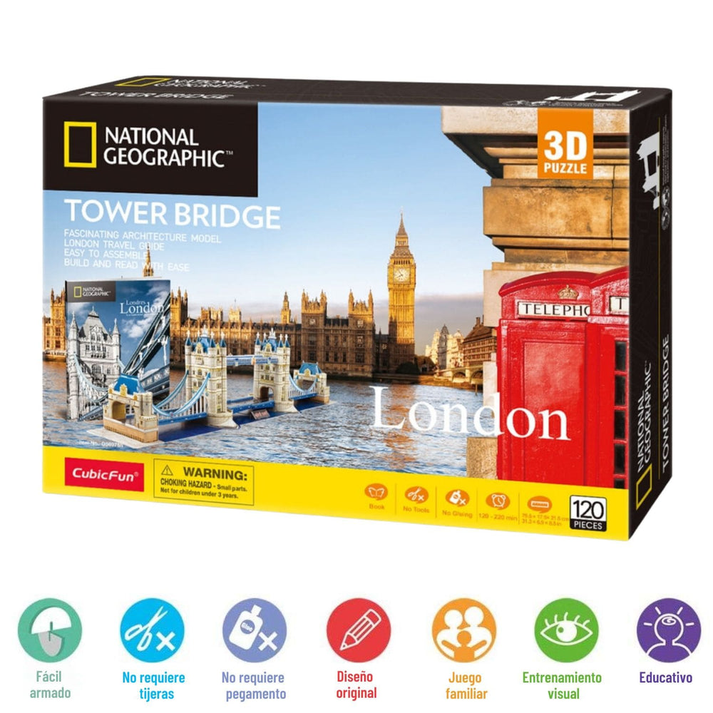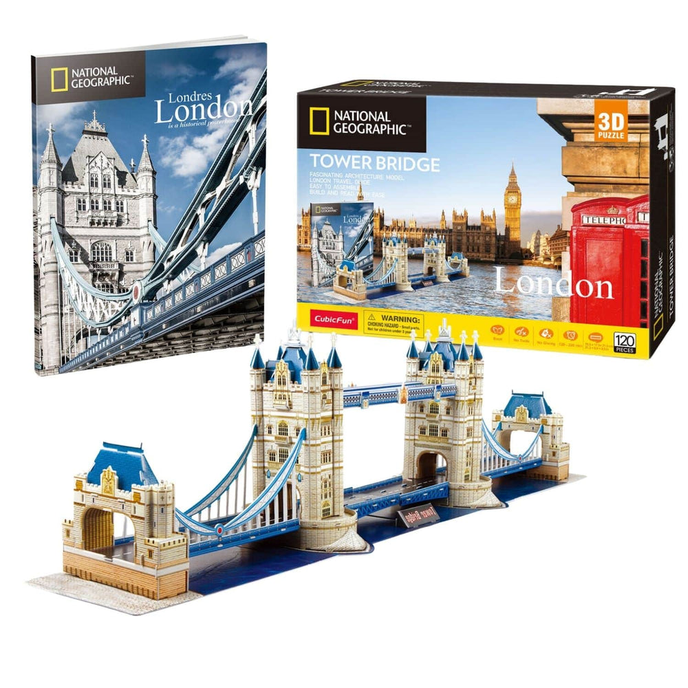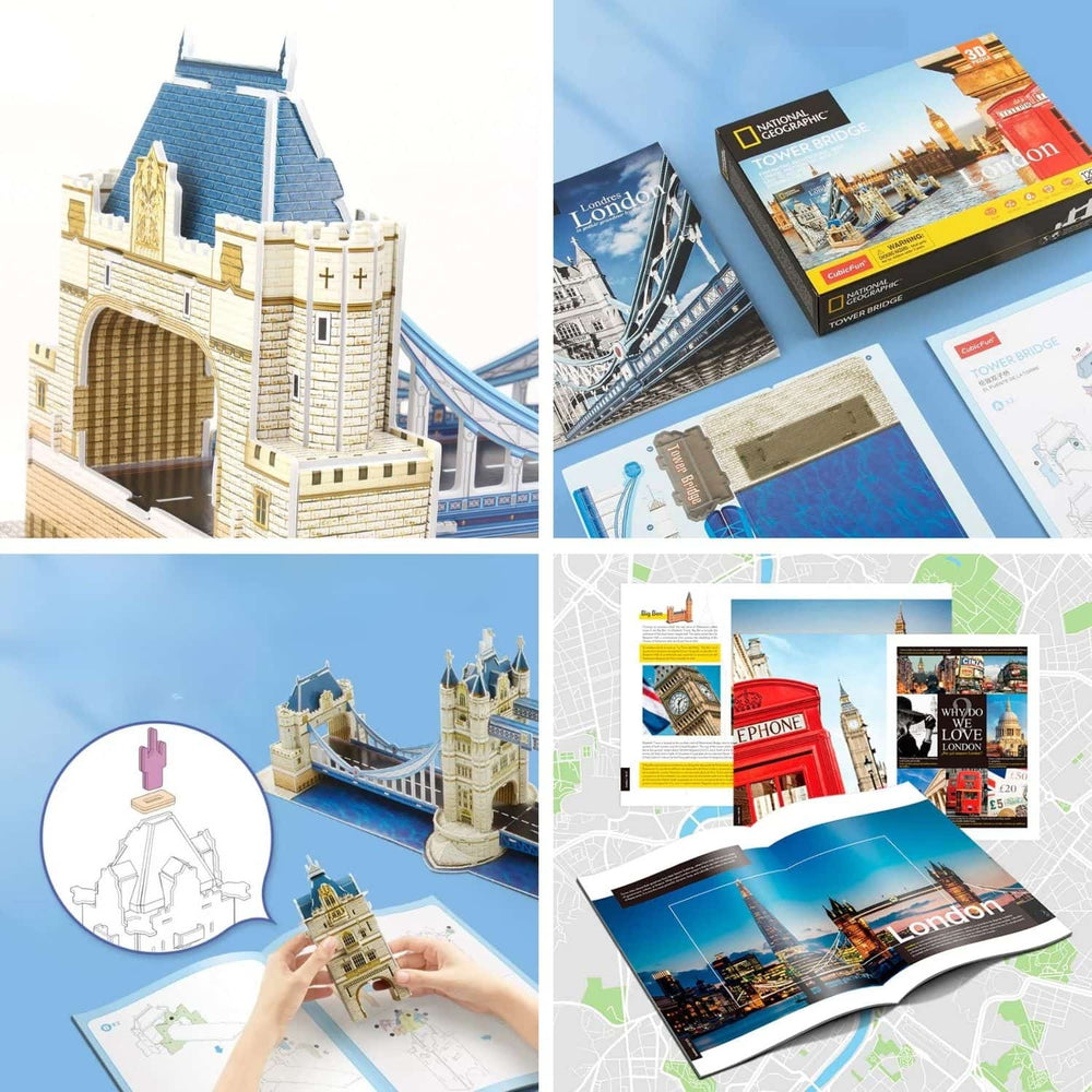 Con los Puzzles 3D National Geographic de Cubicfun podrás revivir fascinantes escenas de las maravillas del mundo moderno, de forma educativa y ecológica, fortaleciendo la concentración y creatividad de niños y adultos. El Puzzle Tower Bridge de Londres recrea uno de los monumentos y maravillas de la ingeniería más famosos de Gran Bretaña. Este conocido puente es hoy una de las vías más importantes para cruzar el río Támesis, pudiendo ser levantado una y otra vez para el cruce de diversas embarcaciones. Incluye un folleto ilustrado coleccionable de la revista National Geographic, de 28 páginas, que entrega datos importantes de esta fabulosa construcción.