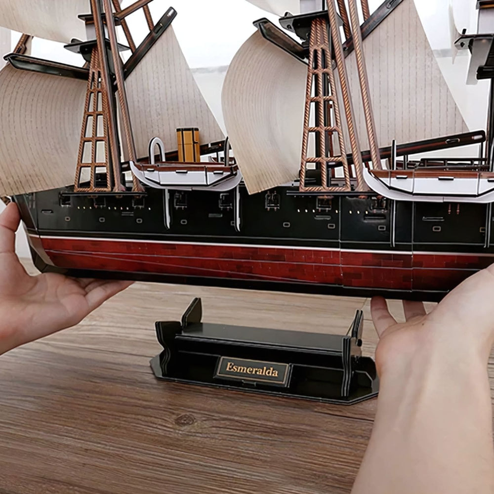 La nave de guerra, Corbeta Esmeralda, un modelo 3D educativo y coleccionable, contiene exquisitos detalles para exhibir en el hogar, la oficina o donde quieras. Esta admirable pieza está fabricada con cartón pluma, sus piezas se ensamblan perfectamente, sin necesidad de pegamento u otro material adicional. El set contiene piezas numeradas e incluye una guía de instrucciones para facilitar el armado.