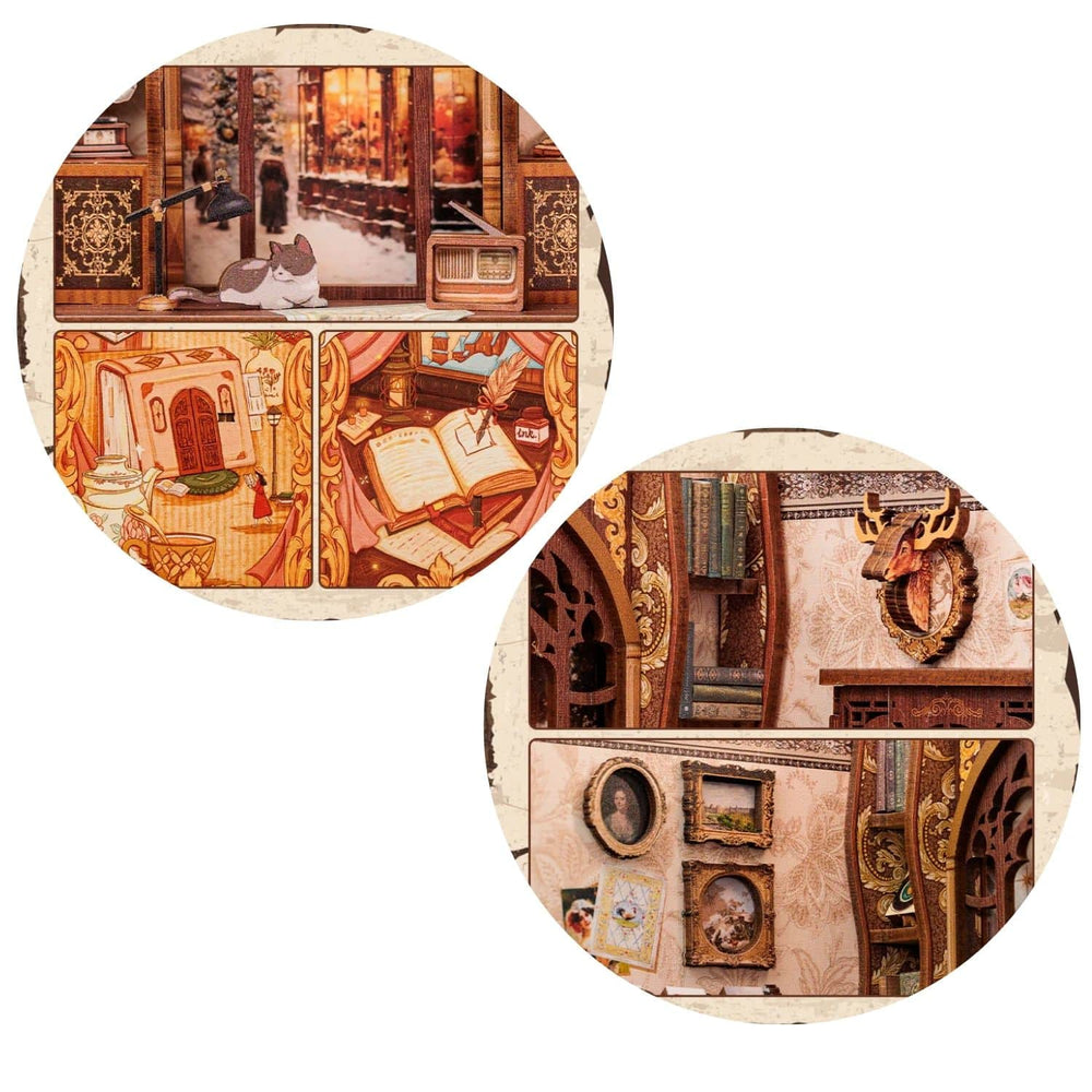 Los Booknooks son separadores de libros en 3D que recrean diversos y cálidos mini ambientes para que construyas tú mismo. Nos trasladan a diferentes lugares en miniatura y le dan un toque único a nuestra biblioteca. Los separadores de libros de Cutebee cuentan con iluminación cálida, la cual se encenderá y apagará al presionar el interruptor. Estas luces añaden calidez y una atmósfera de ensueño a la escena, entregando vida y dinamismo a tu colección de libros, ya sea en la casa o en la oficina.