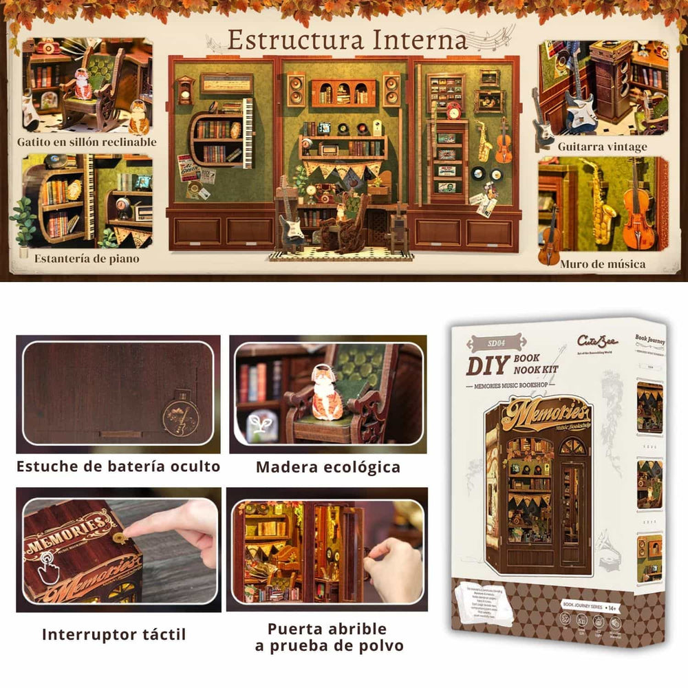 Los Booknooks son separadores de libros en 3D que recrean diversos y cálidos mini ambientes para que construyas tú mismo. Nos trasladan a diferentes lugares en miniatura y le dan un toque único a nuestra biblioteca. Los separadores de libros de Cutebee cuentan con iluminación cálida, la cual se encenderá y apagará al presionar el interruptor. Estas luces añaden calidez y una atmósfera de ensueño a la escena, entregando vida y dinamismo a tu colección de libros, ya sea en la casa o en la oficina.