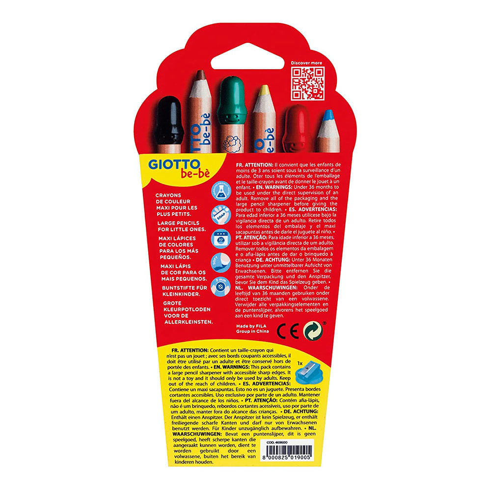 Con estos lápices, los más pequeños ¡pueden crear en grande! La mina de 7 mm permite al niño dibujar y colorear con total libertad y seguridad, además, el tapón de plástico en el extremo del lápiz evita lesiones. Sus colores brillantes y suaves son totalmente lavables. Contiene un sacapuntas especial para afilar y mantener los lápices siempre listos para colorear.