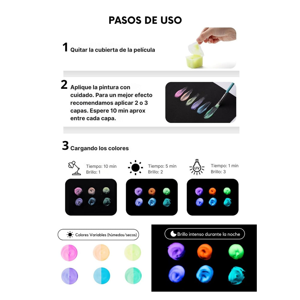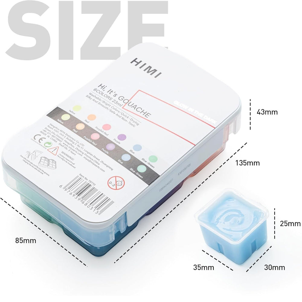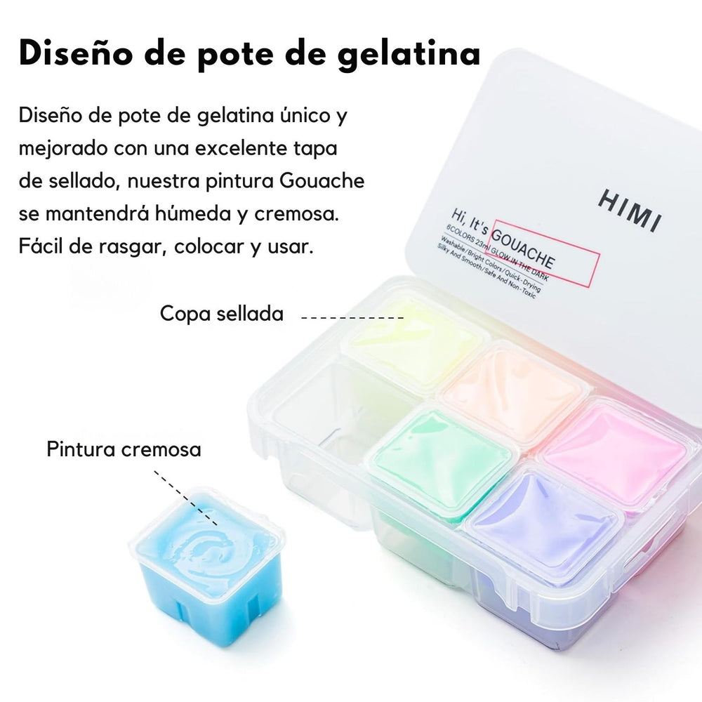 El Set de 6 Pinturas Gouache Glow in the Dark de la marca Himi te entrega colores vibrantes con los que podrás realizar increíbles efectos de brillo en la oscuridad. Después de la carga, estas pinturas de larga duración y ricas en pigmentos, incluyen los siguientes tonos luminosos: Amarillo, Rojo, Rojo violáceo, Morado, Azul y Azul-Verde.