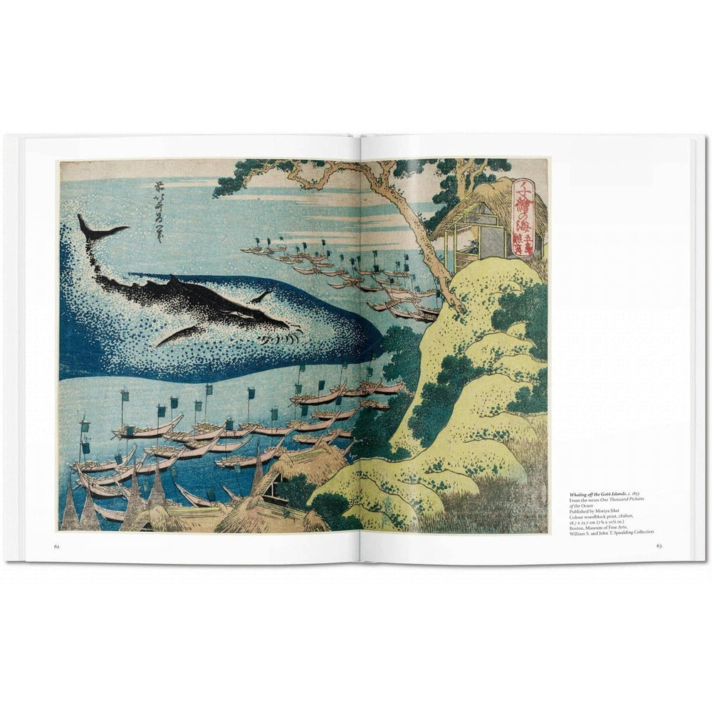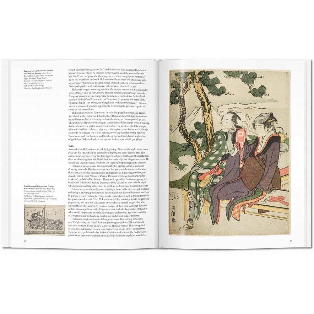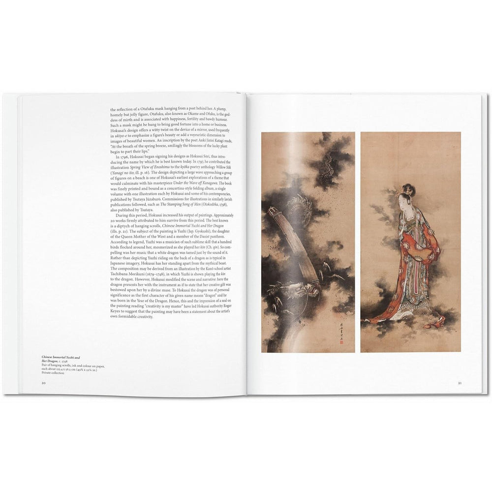 Este libro de Taschen abarca la carrera completa de Hokusai y presenta las obras clave de su amplio porfolio. A través de estas piezas y series, tan majestuosas como meticulosas, recorre la variedad de temática tratada por el artista, desde libros eróticos hasta novelas históricas, así como la evolución de su vívido formalismo y su peculiar organización del espacio por medio del color y de la línea, que liberaría el arte occidental de las limitaciones de la perspectiva única y daría rienda suelta al impulso modernista.