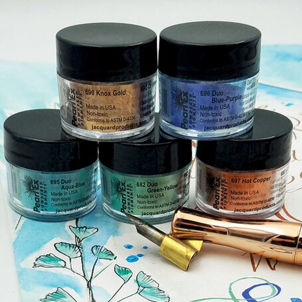 Muy versátil, los Pigmentos en Polvo Serie 3 Pearl Ex se pueden usar para lograr un efecto metálico o nacarado. Puedes mezclarlos con acrílicos, aceites, tintas de impresión, tintas de alcohol, resina epóxica, pegamentos, resinas para moldear, arcilla, barnices... ¡y mucho más! Pruébalo mezclando con goma arábiga para crear una tinta de caligrafía metálica o una acuarela, utilizalos con los extensores incoloros de Jacquard para usar en tela.