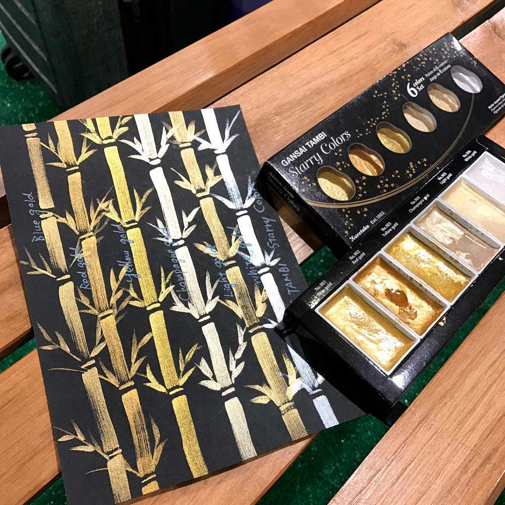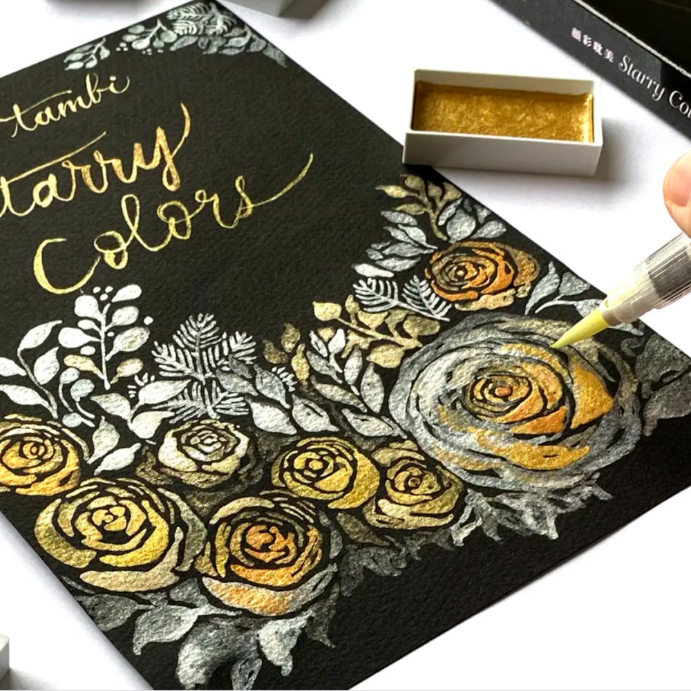 Los intensos colores de Gansai Tambi provienen de tintas pigmentadas con calidad profesional hechas a mano, siguiendo un minucioso proceso de elaboración tradicional japonesa. Estas acuarelas de alta calidad poseen una sensación cremosa y suave al mezclar, su brillo perlado es reluciente. Cada color crea impresionantes efectos metálicos y se puede utilizar tanto en papel oscuro como en papel claro.