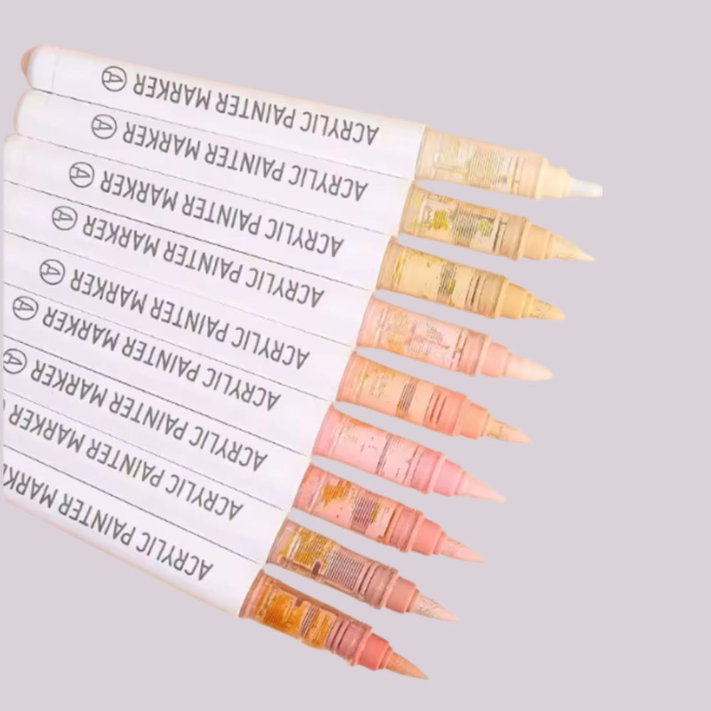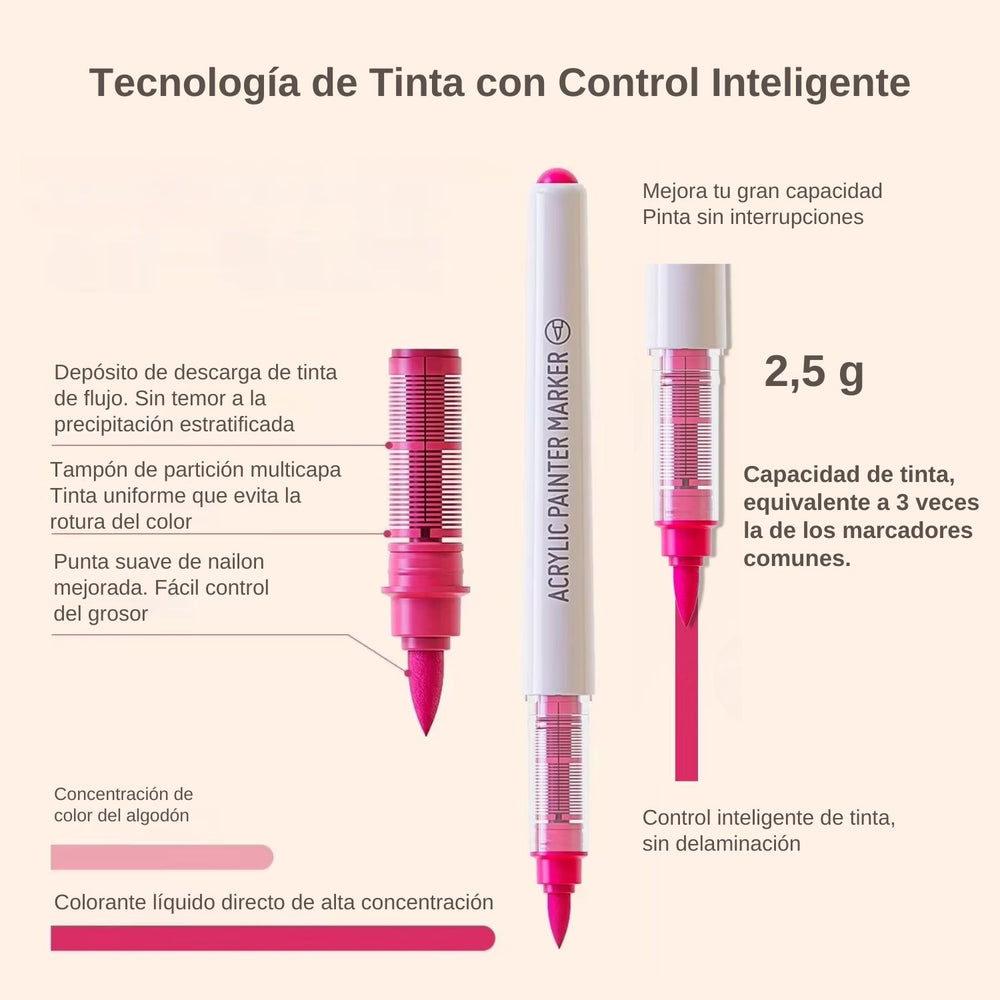 Estos marcadores poseen tinta acrílica y tienen una punta de fibra súper suave, tipo pincel🖌️, que te permite realizar trazos fluidos con un control superior sobre el papel📝. Su salida de tinta es constante y suave🪶, ideal para trabajos detallados. Cuentan con tapas de libre rotación de 720° y cada marcador incluye una tapa del color correspondiente para facilitar su identificación🔍. Son aptos para utilizarlos en variadas superficies, tales como papel, cartones, madera, cerámica, vidrio, piedra, metal, lienzo y más🔥.