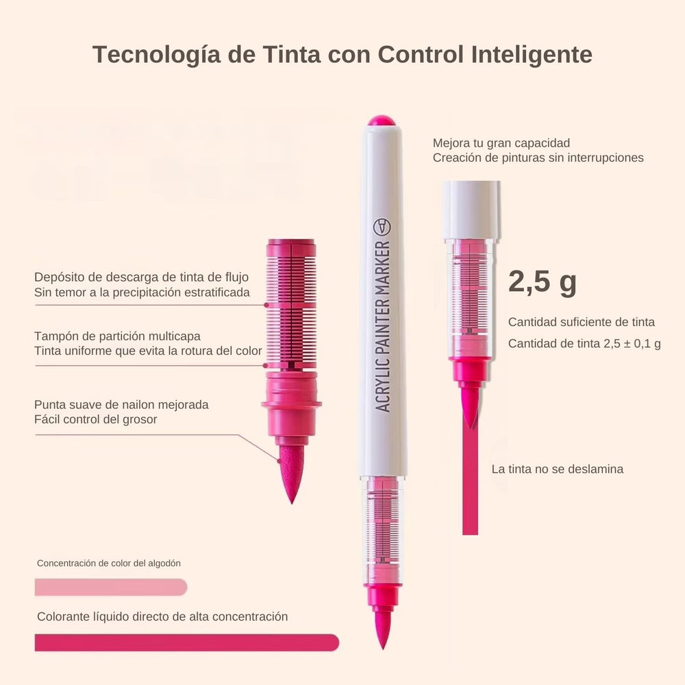 Estos marcadores poseen tinta acrílica y tienen una punta de fibra súper suave, tipo pincel🖌️, que te permite realizar trazos fluidos con un control superior sobre el papel📝. Su salida de tinta es constante y suave🪶, ideal para trabajos detallados. Cuentan con tapas de libre rotación de 720° y cada marcador incluye una tapa del color correspondiente para facilitar su identificación🔍. Son aptos para utilizarlos en variadas superficies, tales como papel, cartones, madera, cerámica, vidrio, piedra, metal, lienzo y más🔥.