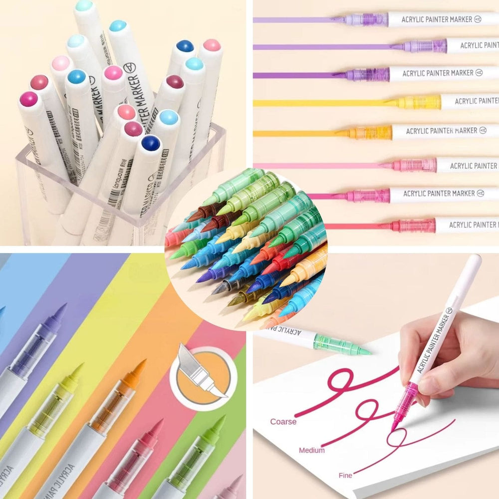 Estos marcadores poseen tinta acrílica y tienen una punta de fibra súper suave, tipo pincel🖌️, que te permite realizar trazos fluidos con un control superior sobre el papel📝. Su salida de tinta es constante y suave🪶, ideal para trabajos detallados. Cuentan con tapas de libre rotación de 720° y cada marcador incluye una tapa del color correspondiente para facilitar su identificación🔍. Son aptos para utilizarlos en variadas superficies, tales como papel, cartones, madera, cerámica, vidrio, piedra, metal, lienzo y más🔥.