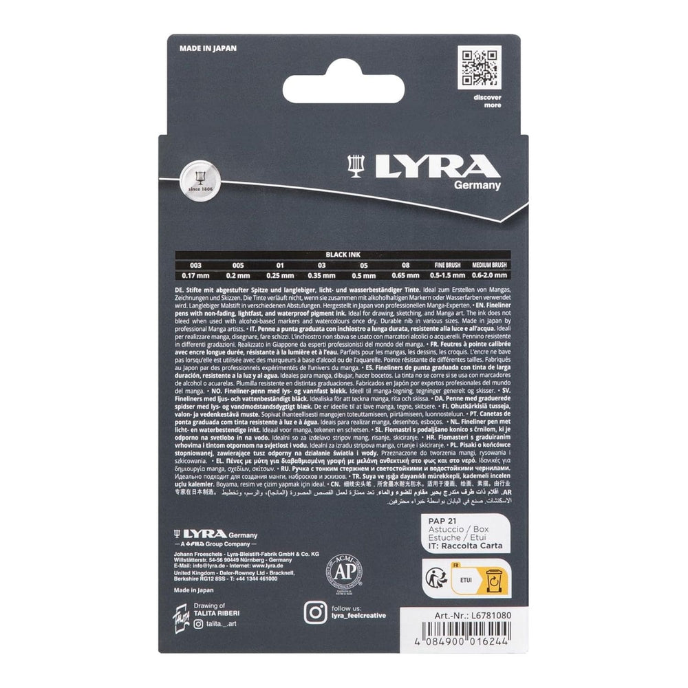 El Set de 8 Tiralíneas Manga Pen de Lyra Graduate contiene rotuladores graduados de calidad japonesa. Equipados con tinta borrable, resistente al agua, que no sangra en combinación con marcadores a base de alcohol y a base de agua. Son la herramienta ideal para realizar cualquier detalle gracias a sus diferentes grados y tipos de punta, desde la más fina de 0,03 mm hasta la punta de pincel de 2 mm. Estos marcadores cuentan con clip metálico e indicación de graduación en el cuerpo del rotulador. Ideales para dibujo manga, dibujo técnico, bullet journal, cómic e ilustración.
