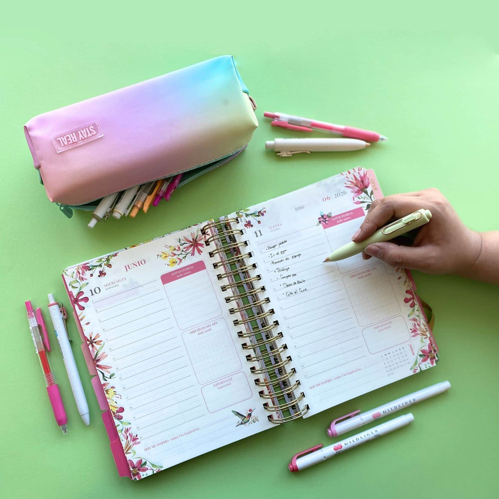 La portada está confeccionada con papel texturizado y detalles en stamping dorado✨. En su interior encontrarás carátulas mensuales en papel grueso con refuerzo en mylar, lo que asegura resistencia y durabilidad 💪📘. Cuenta con elástico de cierre para proteger tus hojas 🧷, stencil resposicionable (plantilla con diseños) 📑 y un sobre impreso de plástico transparente donde podrás guardar tus apuntes y pequeños tesoros ✉️💫. Además, incluye un set de notas adhesivas 🗒️✨, 1 página de stickers full color con stamping tornasolado💖, un calendario anual, una página para tus datos personales 🖊️ y diversas herramientas para organizar tus días. 🌈📅.