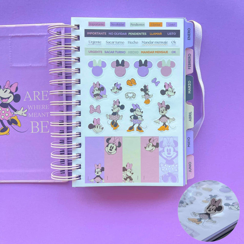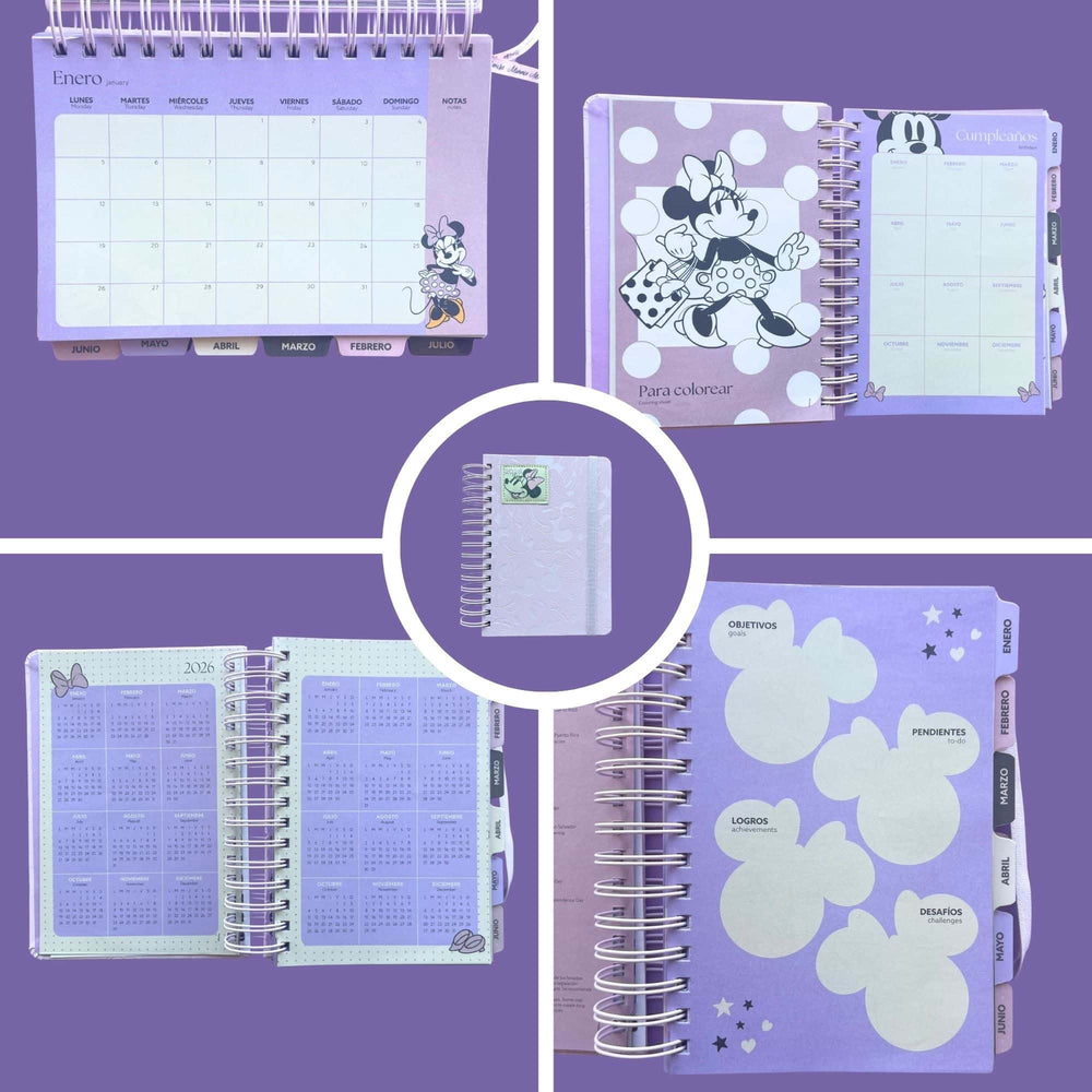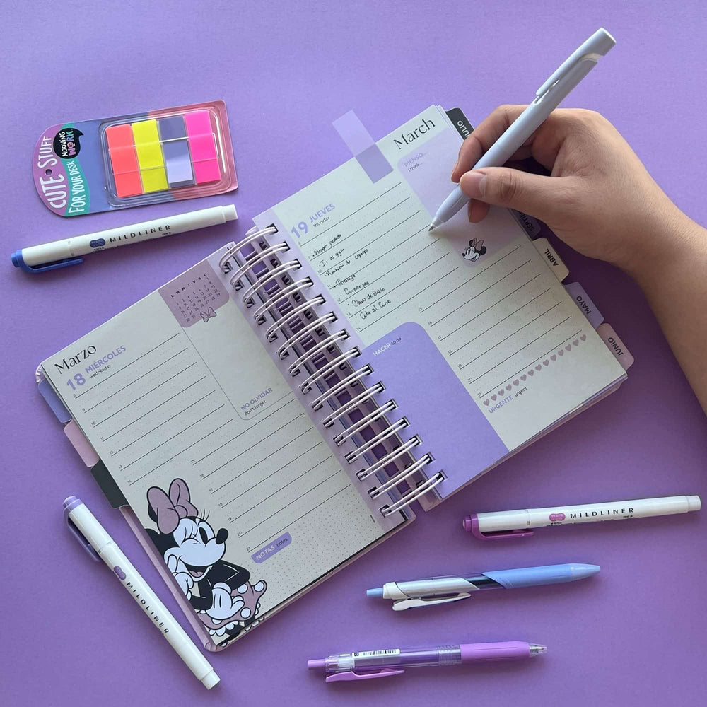 Su tapa lila de poliuretano (PU) con grabado incorpora un delicado aplique textil cosido de la encantadora Minnie💜. En su interior encontrarás carátulas mensuales, elástico de cierre para proteger tus hojas 🧷, cinta señaladora y un sobre de plástico impreso para guardar tus apuntes y pequeños tesoros ✉️💫. Además, incluye un set de notas adhesivas 🗒️✨, 1 página de stickers full color💖, un calendario anual, una página para tus datos personales 🖊️ y diversas herramientas para organizar tus días. 🌈📅.