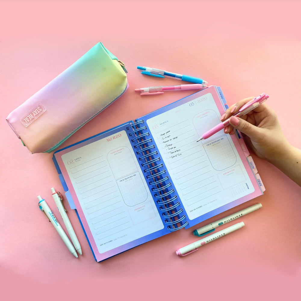 La Agenda tiene tapa acolchada de color azul con detalles en tono rosa💗. En su interior encontrarás carátulas mensuales en papel grueso con refuerzo en mylar, lo que asegura resistencia y durabilidad 💪📘. Cuenta con elástico de cierre para proteger tus hojas 🧷, stencil resposicionable (plantilla con diseños) 📑 y un sobre impreso de plástico transparente donde podrás guardar tus apuntes y pequeños tesoros ✉️💫. Además, incluye un set de notas adhesivas 🗒️✨, 1 página de stickers full color con stamping tornasolado💖, un calendario anual, una página para tus datos personales 🖊️ y diversas herramientas para organizar tus días. 🌈📅.