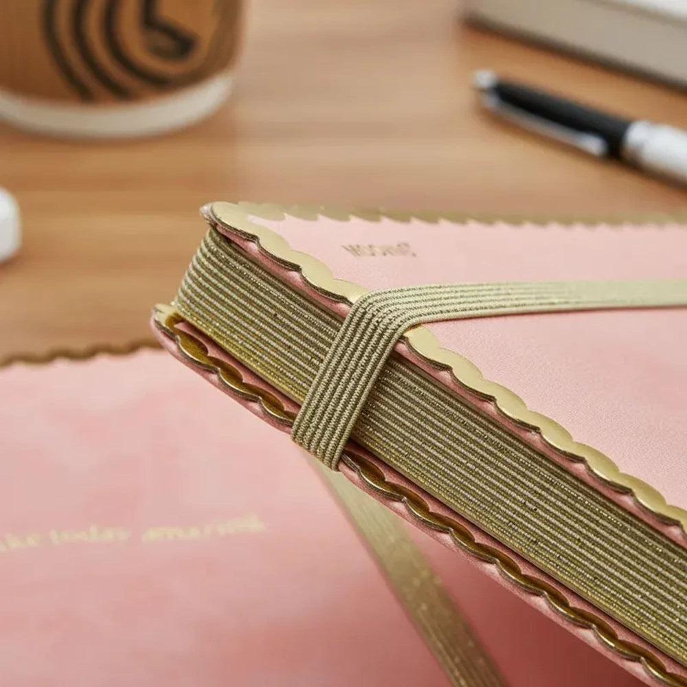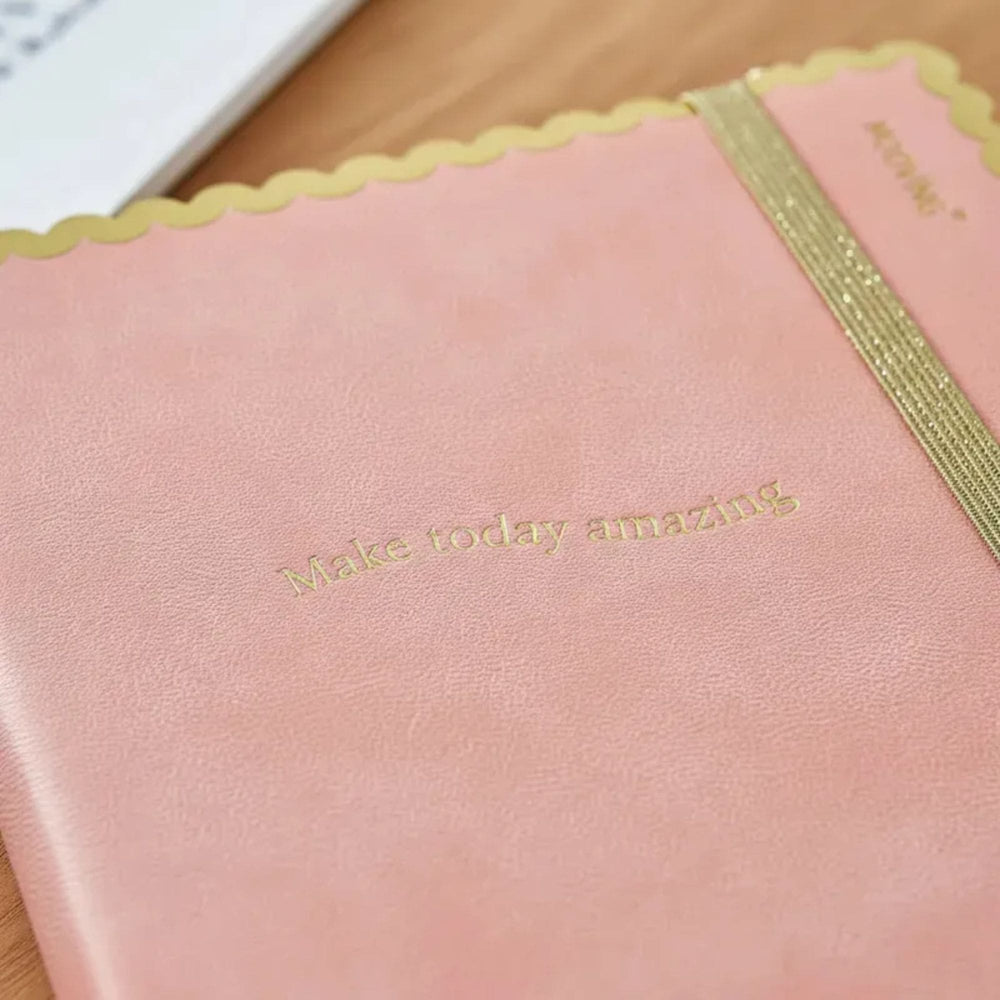 Te encantará su tapa de PU flexible, con detalles dorados brillantes✨ y bordes ondeados, que aportan un toque sofisticado a tus anotaciones ✍️. El cierre con elástico asegura mayor protección y durabilidad de las hojas 📖, mientras que la cinta señaladora te permite ubicar fácilmente la página que necesites💖.