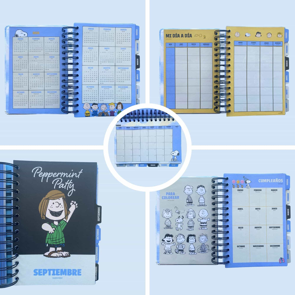 Además, incluye: Presentación - Datos Personales - Calendario 2026/7 - Feriados Internacionales - Evolución de los personajes de Snoopy - Iconos importantes- Para colorear - Cumpleaños - Mi día a día - Próximas vacaciones - Datos curiosos sobre personajes Peanuts por mes - Balance mensual (a fin de cada mes) - Espacio libre para notas.