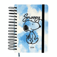 Su tapa forrada en tela de suaves colores blanco 🌫️ y azul cielo💙, cuenta con un exquisito bordado de Snoopy en color negro🖤. Cuenta con elástico de cierre y espirales del mismo tono. En su interior encontrarás carátulas mensuales reforzadas con mylar, cinta señaladora, 1 página de stickers full color y 1 sobre de plástico impreso para guardar tus apuntes y pequeños tesoros ✉️💫.