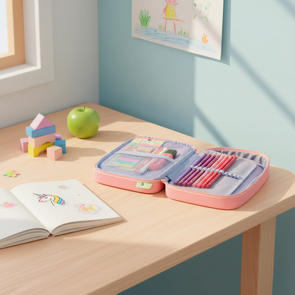 - Maxi estuche es muy amplio, con diseño llamativo de carita feliz.