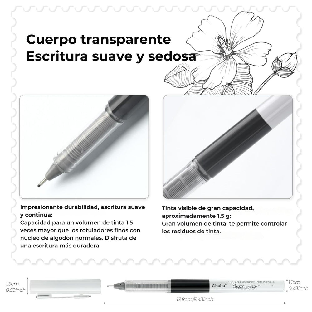 El Set de Tiralíneas Liquid Fineliner Pen de Ohuhu Kohala incluye 9 rotuladores líquidos con diferentes puntas: 003-0,15 mm, 005-0,2 mm, 01-0,25 mm, 02-0,3 mm, 03-0,35 mm, 05-0,45 mm, 06-0,5 mm, 08-0,7 mm y B-Cepillo. Ya sea que estés creando detalles intrincados o trazos atrevidos, ¡estos rotuladores de punta fina satisfarán todas tus necesidades artísticas!