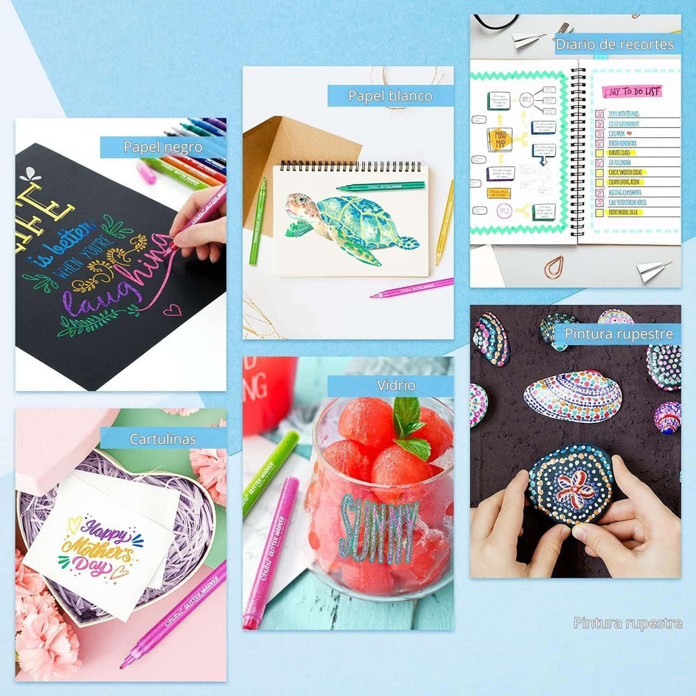 Con los Marcadores Glitter Marker de Ohuhu tendrás color y diversión garantizada. Estos novedosos bolígrafos con efecto metálico poseen purpurina brillante que te ofrece una amplia gama de posibilidades creativas que puedes plasmar en múltiples superficies, tales como papeles claros y oscuros, loza, madera, vidrio, piedras, cartones y más.