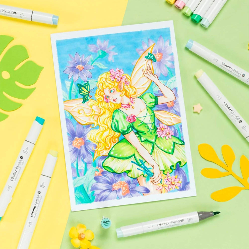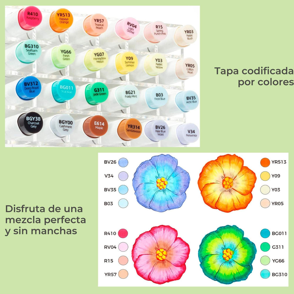 La tinta a base de alcohol se seca al instante ⏱️, no se mancha y es muy fácil de difuminar, lo que te permite crear transiciones suaves y efectos sorprendentes ✨. Sus colores son vibrantes y las tapas están codificadas por tonos 🎨, facilitando la identificación rápida y el flujo natural de tu trabajo creativo. Ya sea para ilustración, diseño, lettering o coloreado, sentirás la libertad de experimentar sin límites.