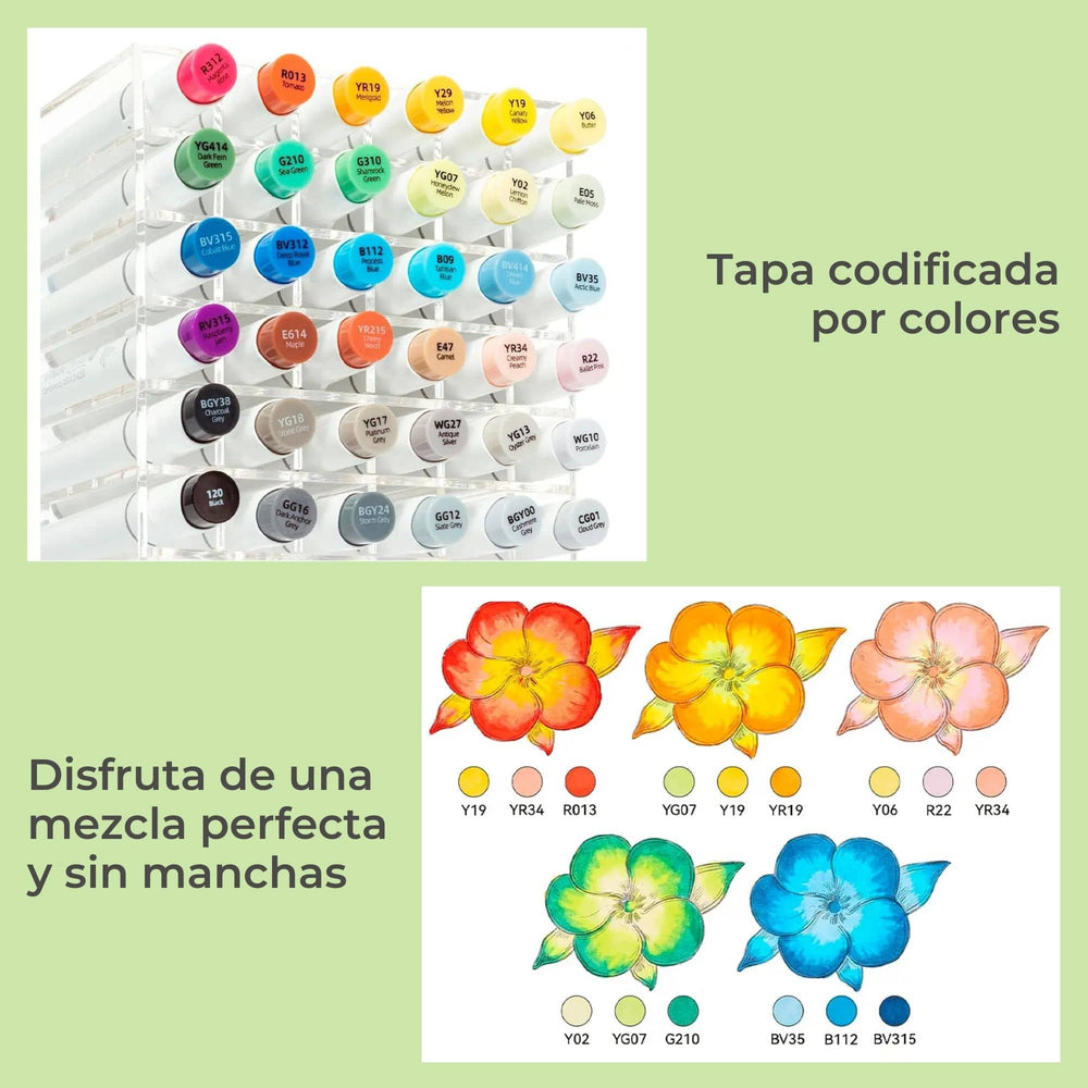 Su tinta a base de alcohol se seca al instante ⏱️, no se mancha y es muy fácil de difuminar, lo que te permite crear transiciones suaves y efectos sorprendentes ✨. Sus colores son vibrantes y las tapas están codificadas por color 🎨, facilitando la identificación rápida y el flujo natural de tu trabajo creativo. Ya sea para ilustración, diseño, lettering o coloreado, sentirás la libertad de experimentar sin límites.
