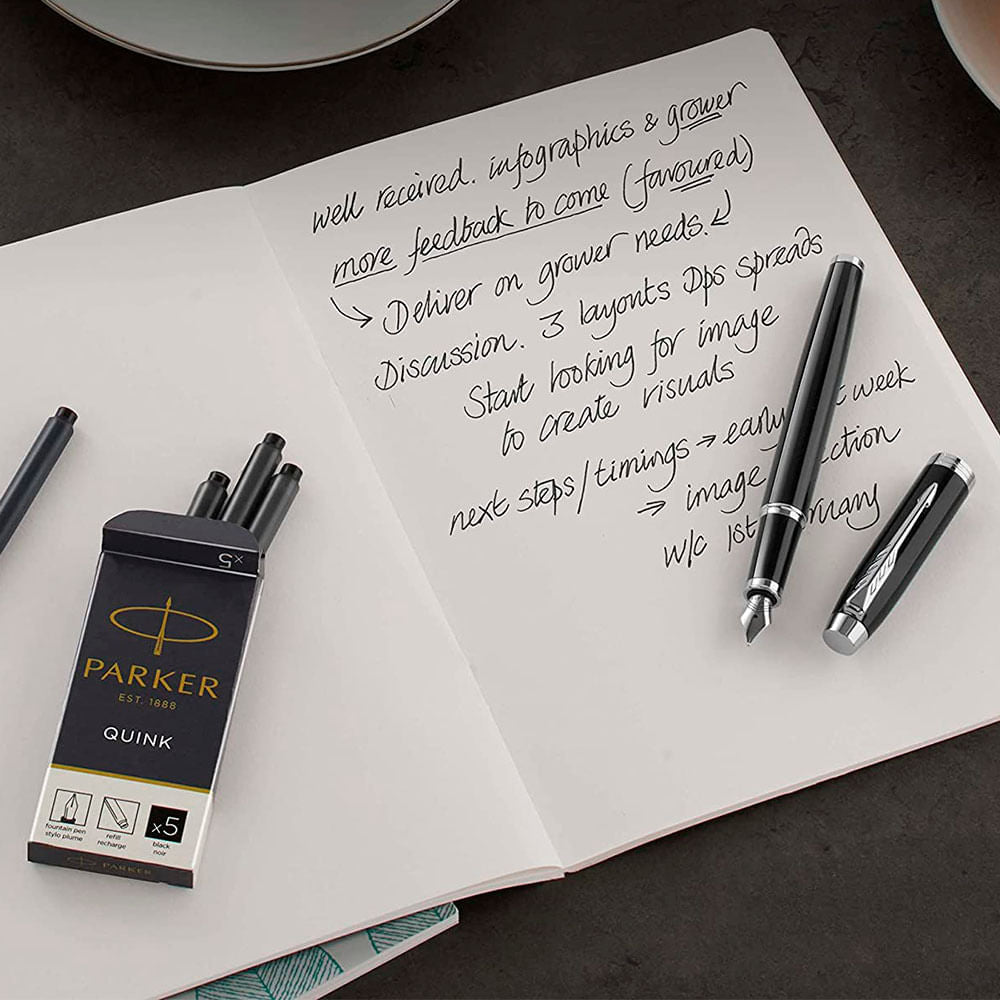 Acabado lacado negro brillante complementado con adornos dorados y el característico clip de flecha PARKER. Punta mediana duradera de acero inoxidable para brindar una mejor experiencia. Agarre cómodo y ergonómico, combinado con la artesanía superior de la marca. Un regalo asequible pero sofisticado, que se presenta en una caja de regalo con un cartucho de tinta QUINK largo azul.