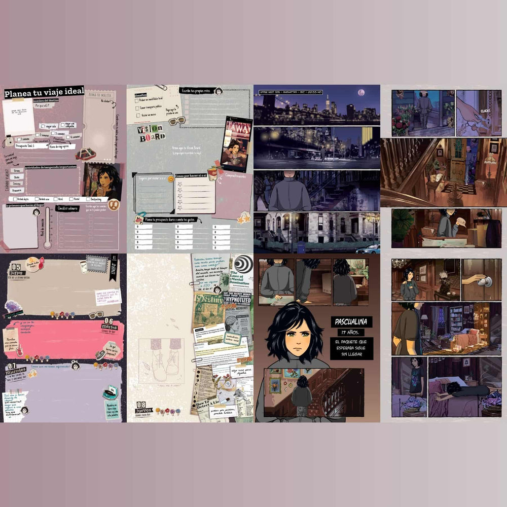 La Agenda pesa 680 g, mide 22,7 cm de alto x 19 cm de ancho (incluyendo el espiral) y posee un empaque individual con termocontraíble 📦. Agenda, diario de vida y novela gráfica ¡todo en uno! 🎭 Cuenta con todo lo que necesitas para registrar tus días con diversión y estilo 🌈💜