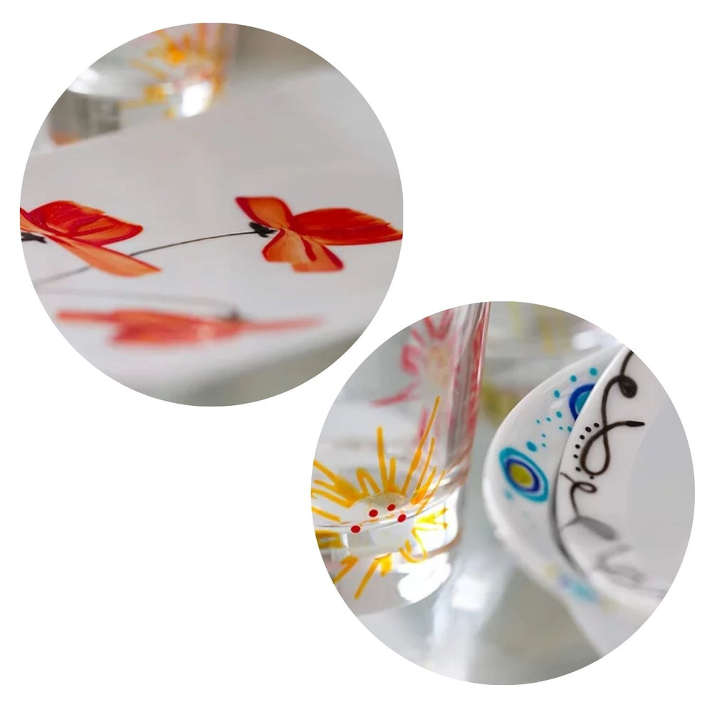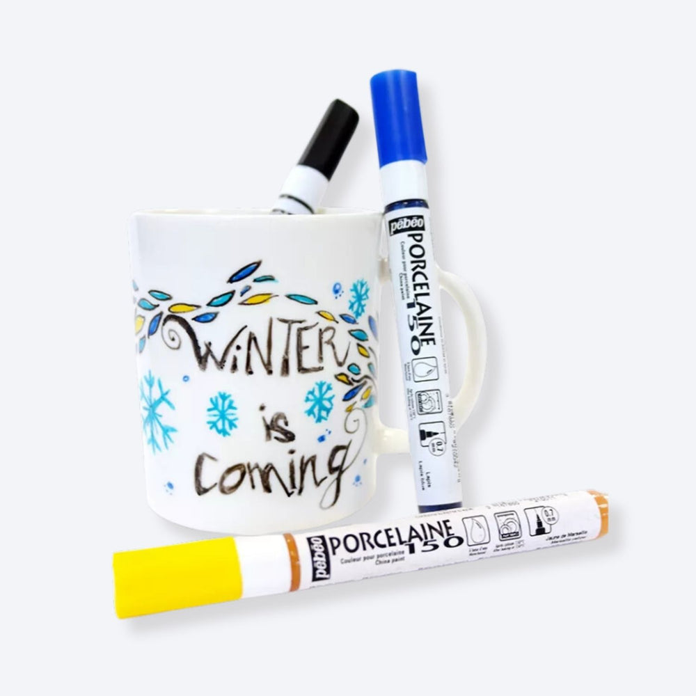 Los Marcadores Porcelaine 150 de la marca Pebeo contienen una pintura apta para porcelana y loza que se fija horneando el objeto decorado a 150°C, en cualquier horno doméstico, por 35 minutos aproximadamente. Sus colores son profundos y brillantes, son translúcidas u opacas, se pueden mezclar entre sí y tienen un magnífico aspecto esmaltado después de la cocción. La elección del soporte y de los instrumentos empleados (pincel, esponja, plantillas) permitirá jugar con los efectos: la transparencia y la intensidad de los colores.