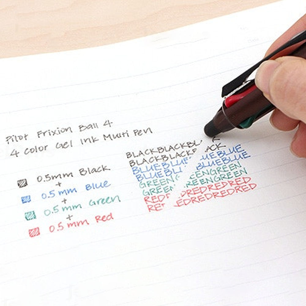 Cada lápiz contiene 4 colores: Negro, Azul, Rojo y Verde, los cuales puedes ir seleccionando según tus necesidades. Para borrar, utiliza el borrador que se encuentra en la parte superior del lápiz y frota suavemente sobre la superficie que deseas corregir. Una vez que la tinta se haya enfriado, puedes volver a escribir o dibujar sobre ella sin problemas.