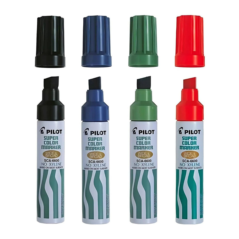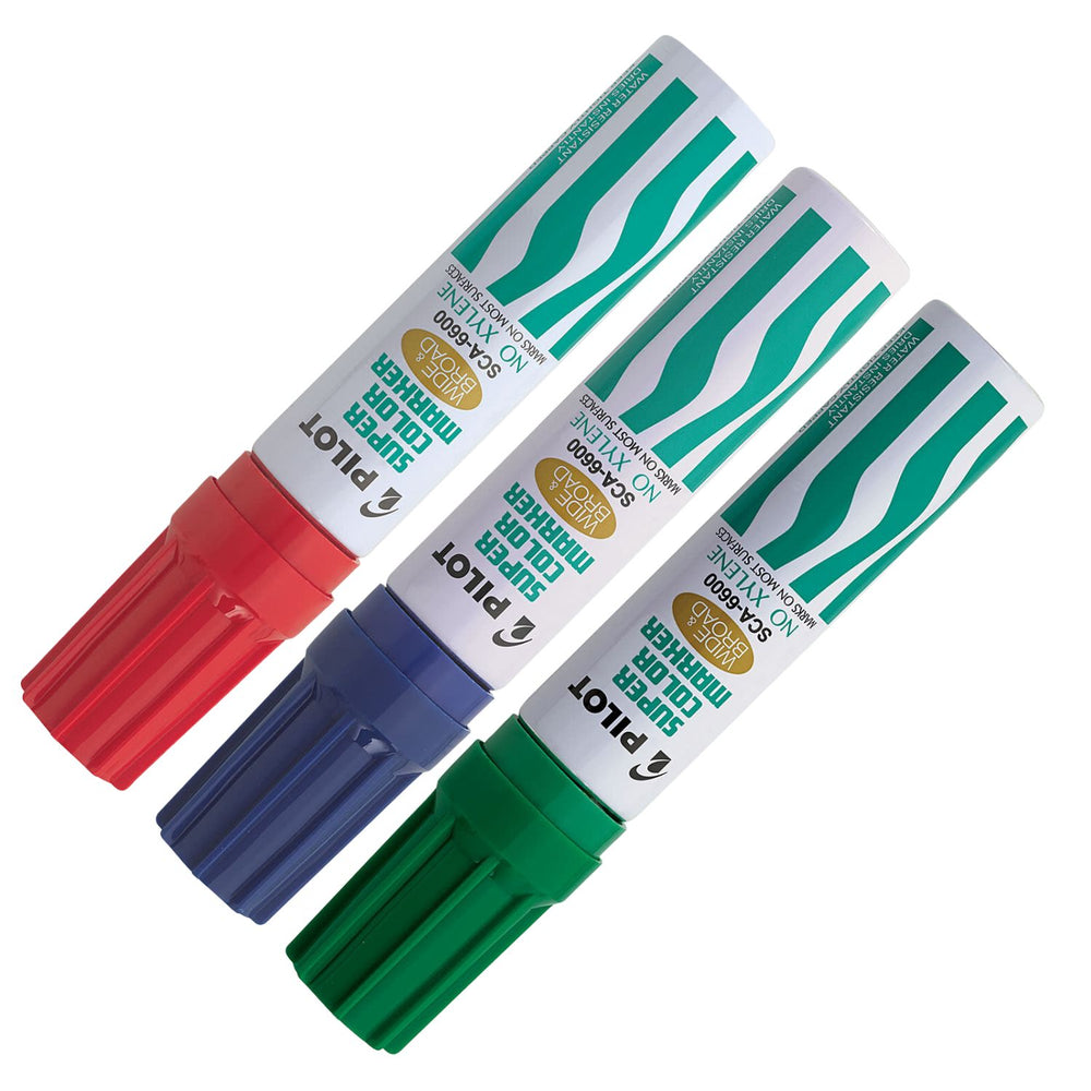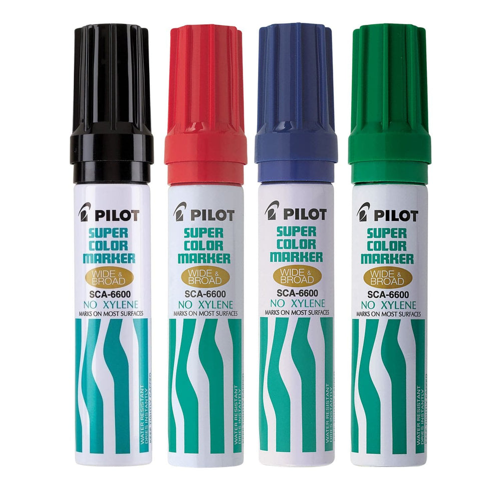 Los Plumones Permanentes Punta Jumbo de la marca Pilot poseen punta biselada de gran tamaño y los encuentras disponibles en cuatro colores: Negro, Rojo, Verde y Azul. Estos marcadores industriales te permitirán escribir prácticamente sobre cualquier superficie, tal como madera, metal, plástico, papel, vidrio y más. Su tinta es resistente al agua, sin xileno y se seca al instante. Al ser recargables, te aportarán mayor durabilidad y, al mismo tiempo, te permitirán cuidar el medio ambiente.
