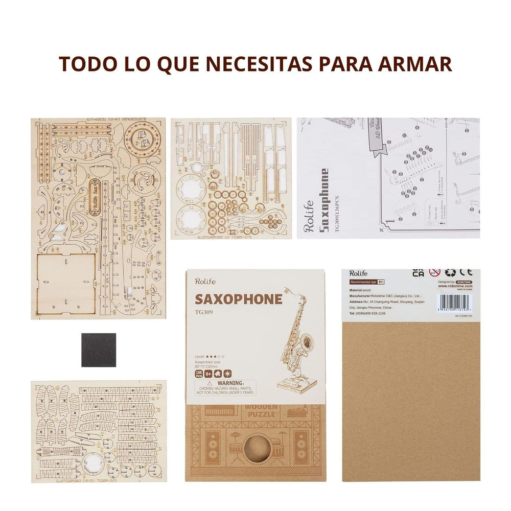 El Puzzle 3D Saxophone de Rolife Classical es un modelo a escala de un Saxofón el cual puedes armar tú mismo💙. Es una miniatura de madera para ensamblar que cabe en la palma de la mano✋. Siente la gracia y la elegancia del Saxofón que una vez terminado puede ser una exquisita decoración para el hogar✨.