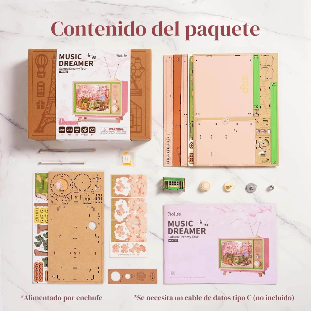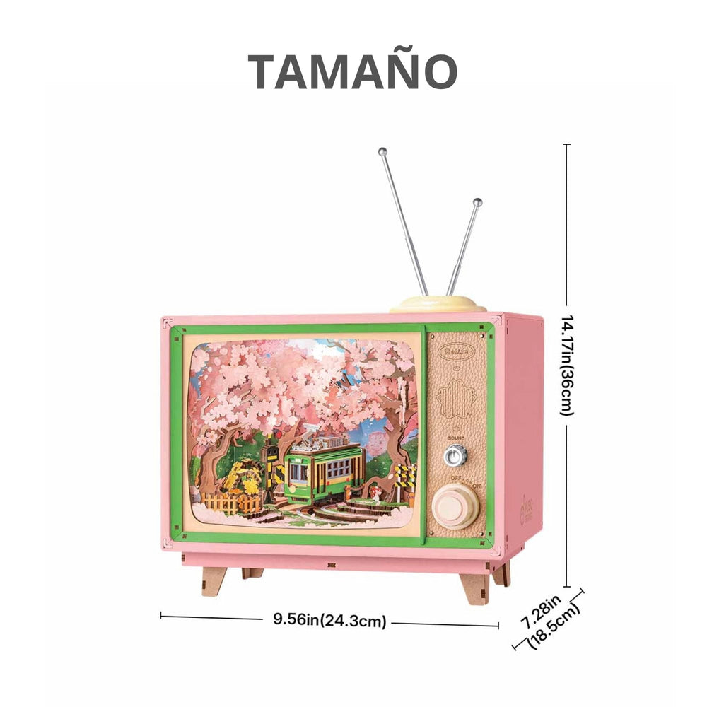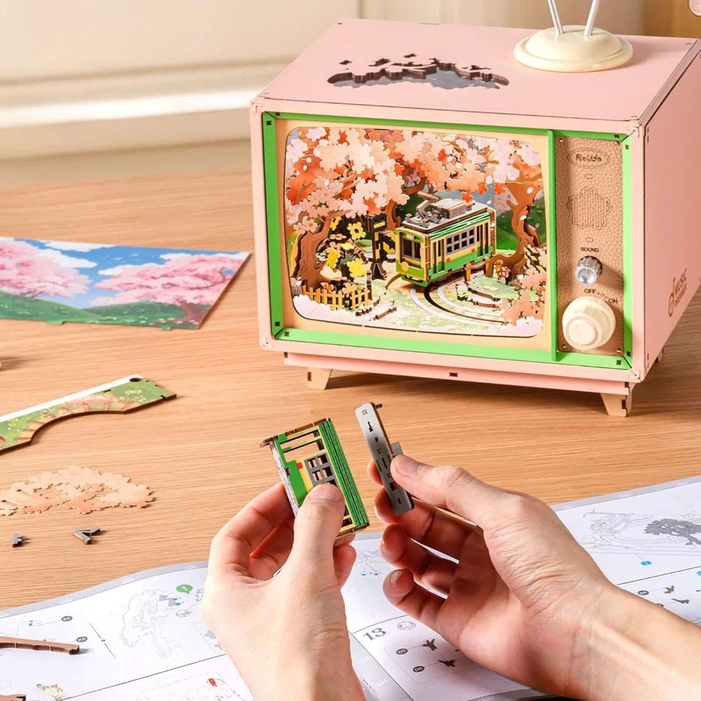 El Puzzle 3D Sakura Dreamy Tour 🌸 es un rompecabezas, caja musical y pieza decorativa que recrea una cálida escena en escala y la armas tú mismo ✨. Sintoniza un mundo de flores de cerezo y viajes primaverales con esta caja de música en forma de televisor vintage que muestra una vista tranquila del tranvía verde de Japón con una suave iluminación, tonos pastel y música suave 🎶.