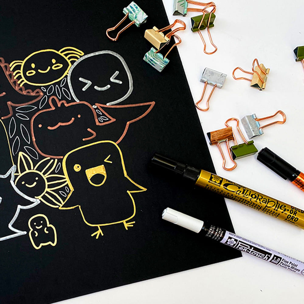 Con los Marcadores Medios Pen-Touch de la marca Sakura dibuja o escribe en colores con un efecto metálico. Ideales para decorar tarjetas de felicitación, objetos artesanales y más. Poseen buena adherencia en la mayoría de las superficies como metal, vidrio, madera, porcelana, plástico y papel. Ilumina la oscuridad con estos colores claros de excelente calidad japonesa. No contienen xileno y son bajos en olor.