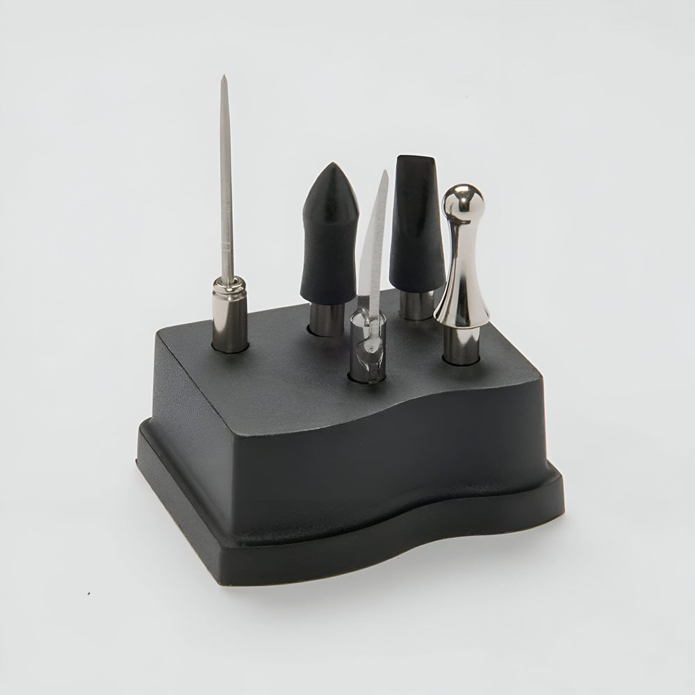 : | 1 Herramienta imantada y 6 Accesorios: 1 Cuchilla 1 Delineador con Punta de Cono 1 Afilador con Punta de Cincel 1 Punta de Bola 1 Herramienta de Aguja 1 Base para Organización |