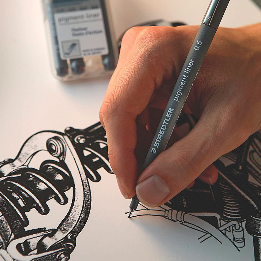 Los Tiralíneas Pigment Liner de la marca Staedtler ofrecen tinta pigmentada, indeleble, resistente a la luz y al agua. Con su larga punta de metal, estos tiralíneas son ideales para trabajar con reglas y plantillas. Su diseño ergonómico permite escribir y pintar de manera fácil y relajada. La tinta Drysafe significa que el bolígrafo se puede dejar sin tapa durante días sin secarse.