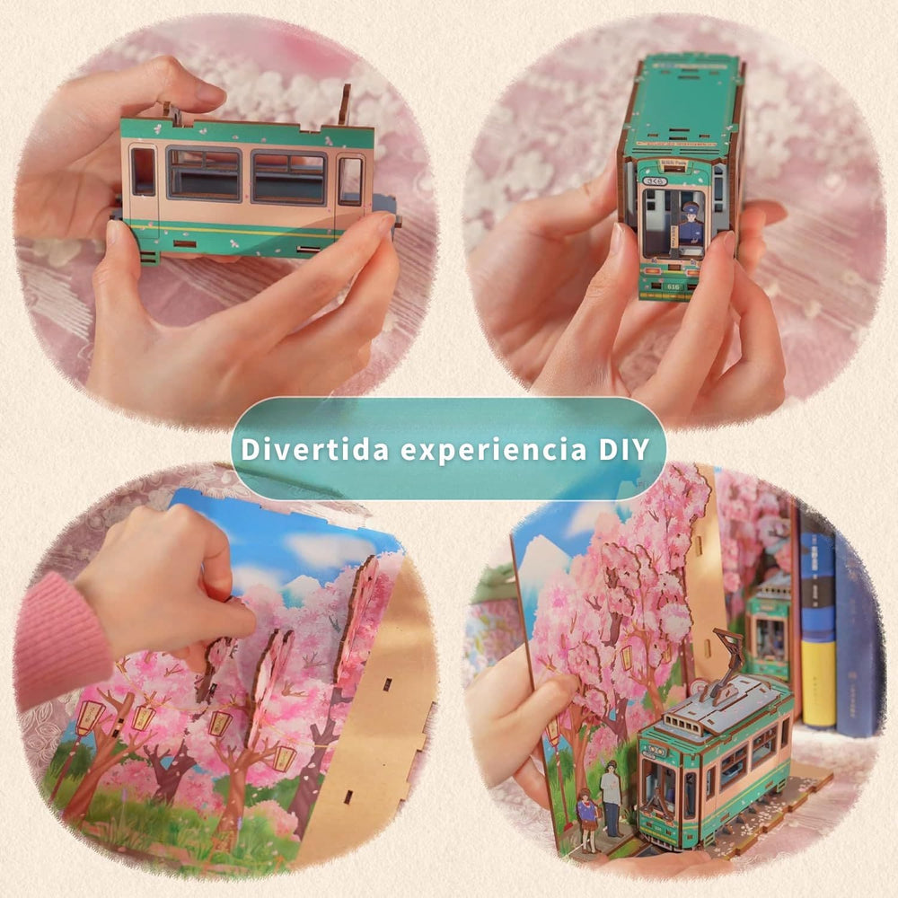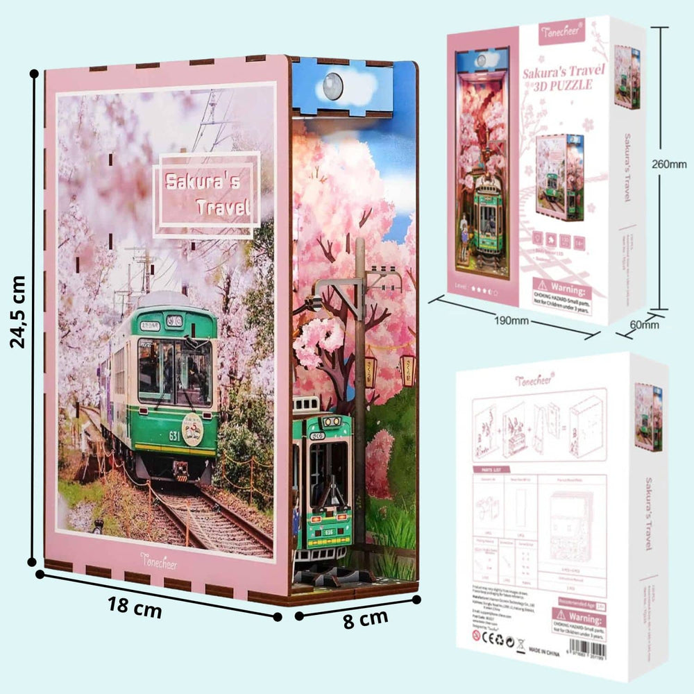 Con el Separador de Libros Sakura's Travel de Tonecheer Book Nook podrás organizar tus libros y decorar ambientes con toque de belleza oriental. ¡Qué hermosa nube rosa adorna tu estantería! El viaje durante el Sakura representado en un rincón de libros. Eso significa flor de cerezo en japonés. Para los japoneses, el Sakura significa un nuevo comienzo después de la mortalidad, lo llaman hanami. Durante el período de floración se celebra el hanami, donde los tranvías pasan junto a los cerezos. Luego, los japoneses hacen un picnic bajo los árboles en flor. Y eso es exactamente lo que ves en tu kit de bricolaje.