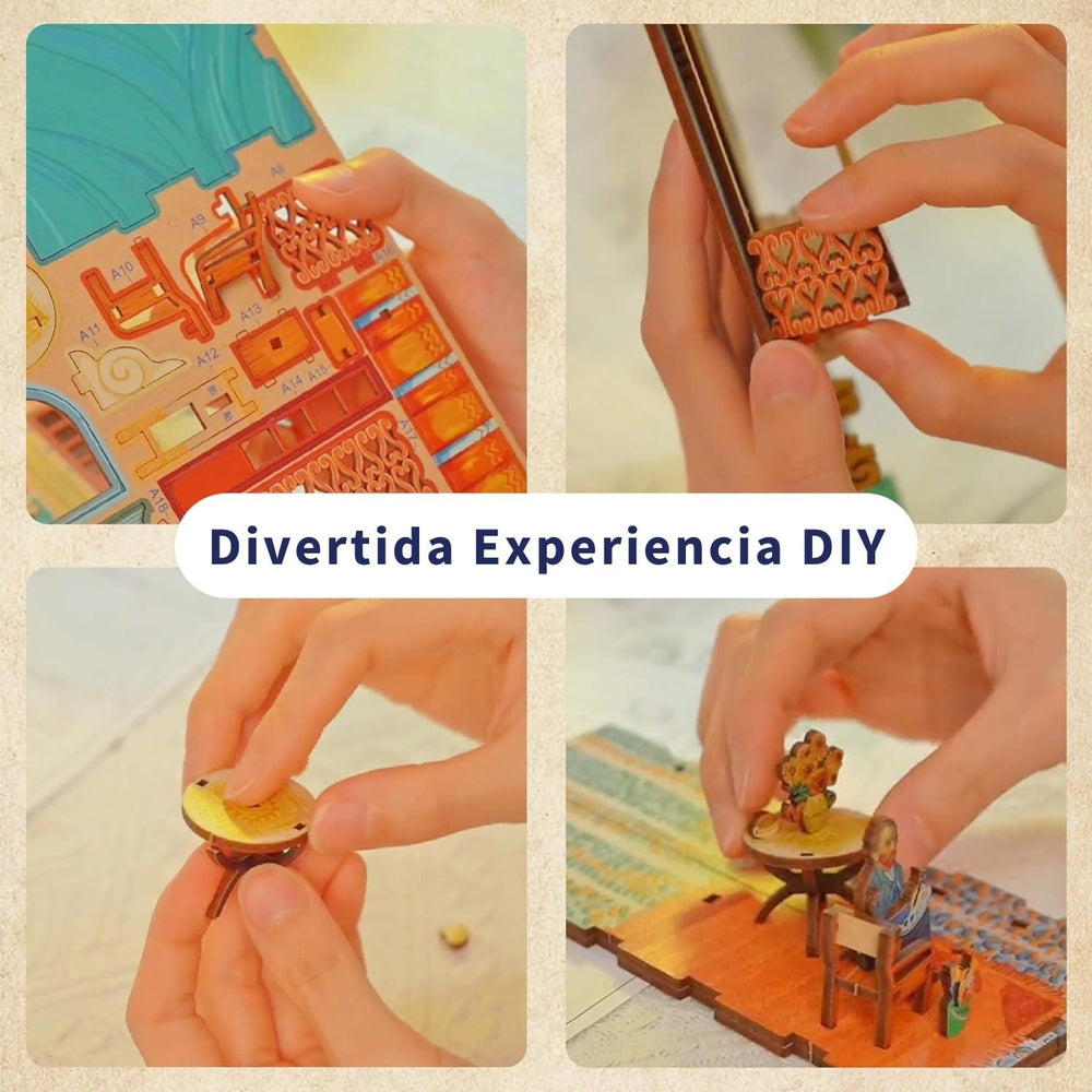 Con el Separador de Libros Vincent's World de Tonecheer Book Nook podrás organizar tus libros y decorar ambientes con un toque artístico. Este kit de bricolaje muestra a Vincent pintando en un patio lleno de estrellas, y la pintura en el tablero es la famosa pintura "La noche estrellada". Los girasoles que florecen en la mesa del fondo también se parecen a la famosa pintura de Van Gogh "Girasoles", y el rincón de lectura está lleno de un fuerte sabor artístico. Disfruta haciendo este kit de construcción de madera que te trasladará a un fantástico mundo de colores.