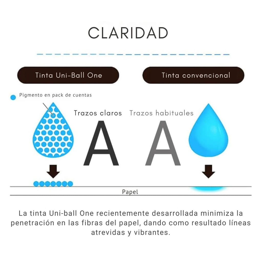 Su clip es ancho y corto para que no toque tu mano al escribir y, al igual que la serie "uni-ball one", es móvil y se puede enganchar fácilmente en cuadernos y libretas. La punta del bolígrafo cuenta con un mecanismo estabilizador de metal que proporciona una experiencia de escritura estable. El recambio es el mismo que el de la serie "uni-ball one" y está equipado con tinta que produce colores vívidos, sin manchas. Edición limitada, disponible en 2 tonos. ¡Utiliza estos fabulosos bolígrafos que te entregan funcionalidad, comodidad y estilo!