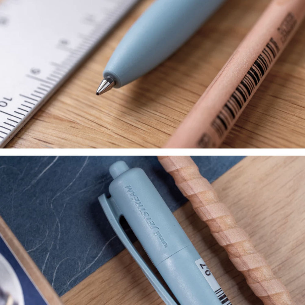 El Bolígrafo Ocean Plastic de Uni Jetstream es ecológico, el primero en el sector de la papelería certificado en la categoría de producto Eco Mark nº 164, "Productos fabricados a partir de residuos plásticos marinos reciclados". Su textura mate le da un toque minimalista que combina con la vida cotidiana. Además, la forma del clip está diseñada para parecerse a una banda de Möbius, que representa la circulación y la regeneración. El diseño utiliza un tono azul claro, evocando la imagen de un océano en calma. Incluye tinta a base de aceite, que se seca súper rápido, favoreciendo la escritura de personas zurdas. Además, presenta una fricción ultrabaja, hasta un 50% menor en comparación con los bolígrafos convencionales, entregando una escritura suave y con poca resistencia.