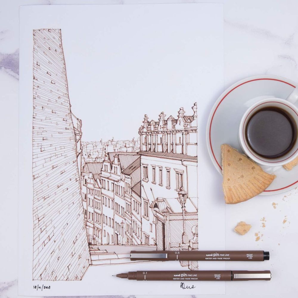 Bolígrafo, amado por arquitectos, artistas y diseñadores gráficos. La línea de tinta pigmentada sólida se puede utilizar fácilmente con acuarela, ya que la tinta no se mancha cuando está mojada.