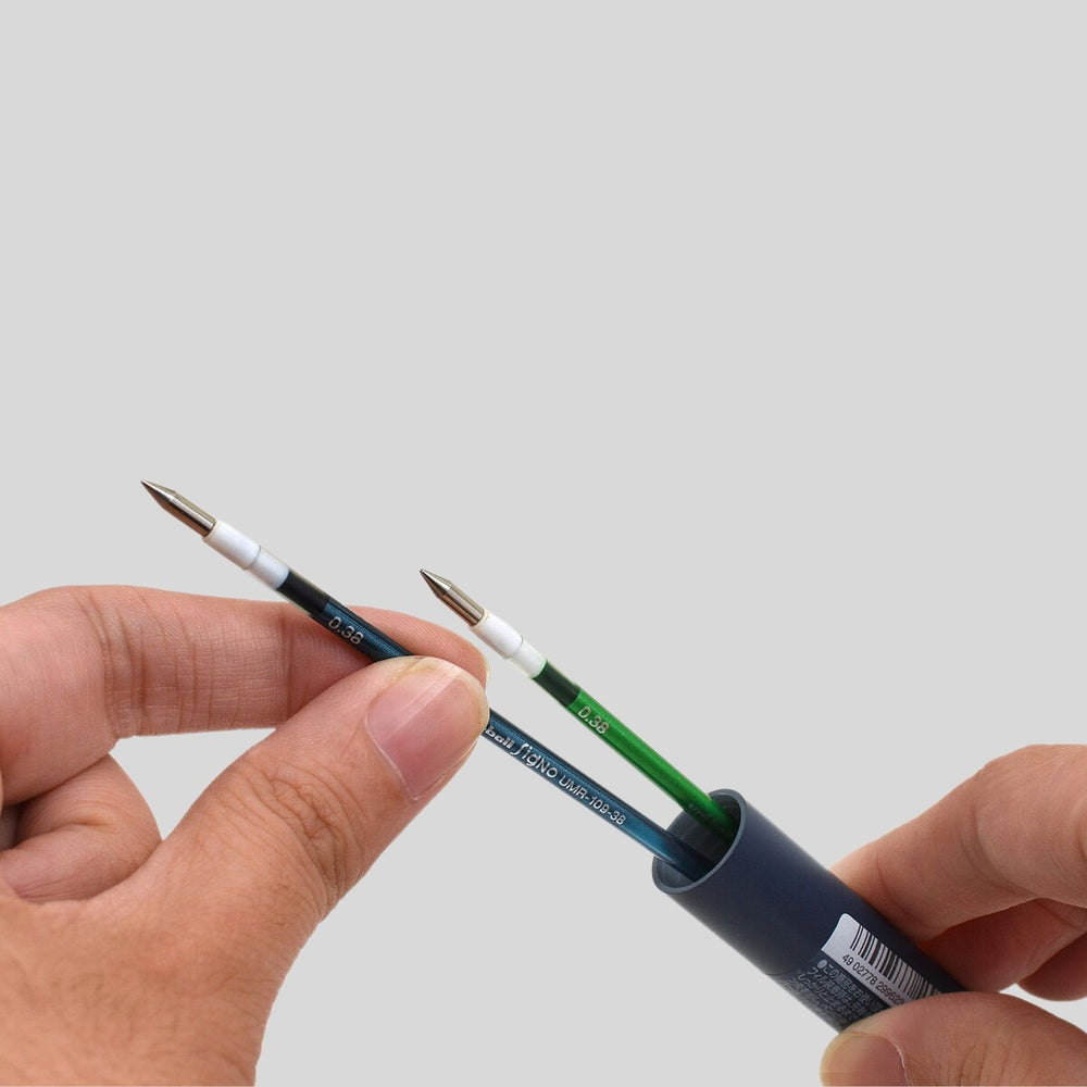 Lo encuentras disponible en hasta diez distintos colores de cuerpo y puedes recargarlo con distintos colores de tinta y además con una mina, cuando se te acaben, lo recargas y listo 😍. Compatible con recambios UMR-109-05 (tinta gel pigmentada), SXR-89-05 (Tinta Jetstream híbrida: mezcla de gel y aceite) y M5R-189 (minas 0,5 mm). No incluye recargas.